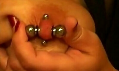 nippleringlover - horny cougar masturbating pierced pussy with anal massager and extreme giant nipple ring