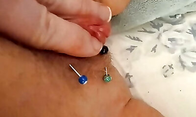 nippleringlover - horny milf masturbating pierced pussy with big fake penis and extreme piercings, giant nip rings